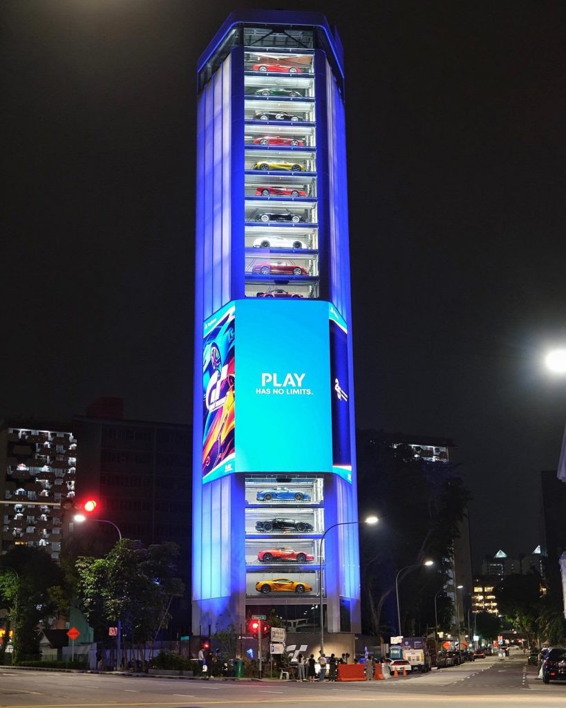 A Sony criou uma publicidade impactante para promover o lançamento de Gran Turismo 7 no mercado asiático, decorando um prédio extravagante em Singapura com 15 super-esportivos “empilhados” na fachada.